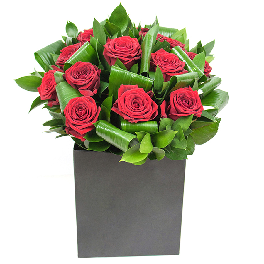 Brighten any room with our Radiant Red Roses & Greenery arrangement. This beautiful bouquet features vibrant red roses intertwined with aspidistra leaves and ruscus, creating a harmonious and eye-catching display.